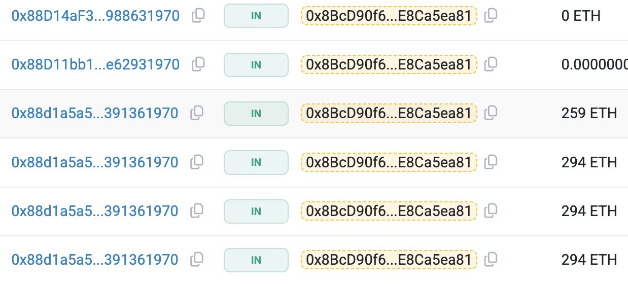 0xe3E73f1E6acE2B27891D41369919e8F57129e8eA(~$3.2M)0x5FF8645BbC6c8B4390aA228A3e8bf08240F333b4(~$15K)