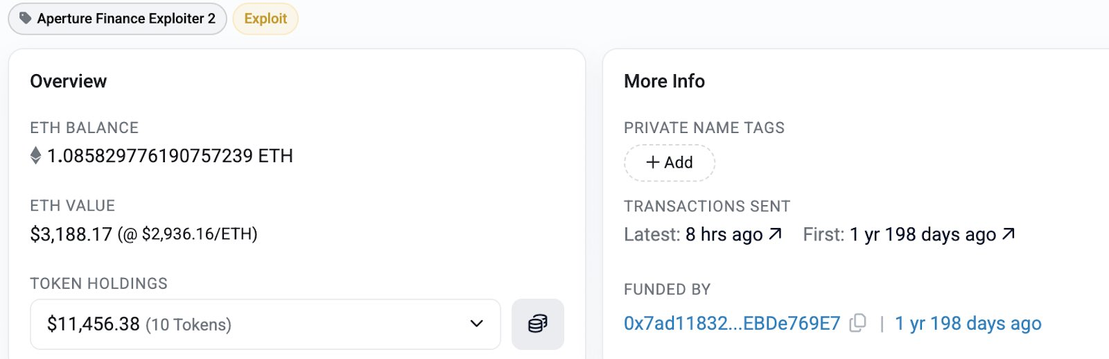 Our clustering analysis identified a second, distinct wave of activity occurring hours after the initial exploit. This "copycat" attacker focused on Aperture Finance specifically, holding funds at: