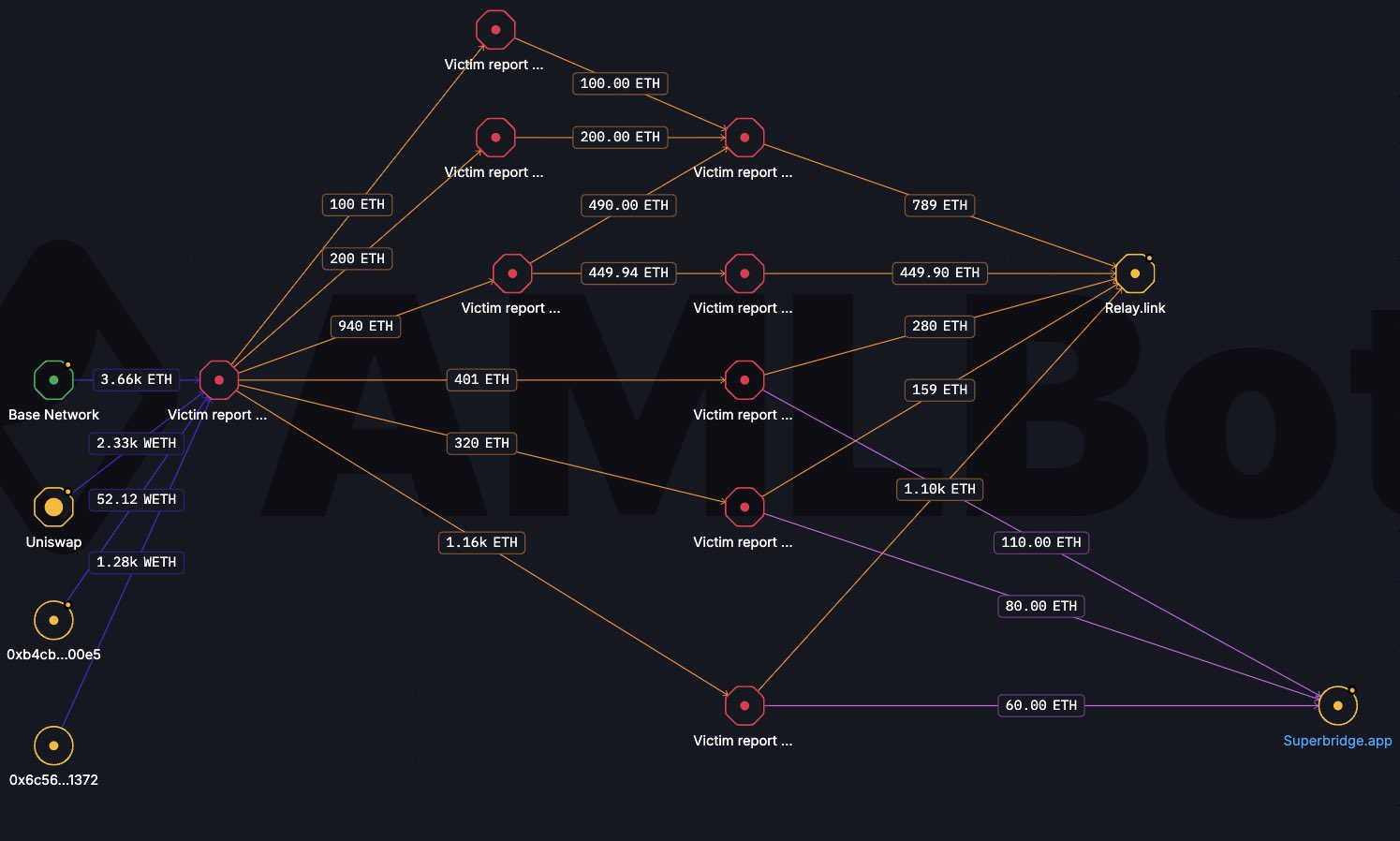 The attackers followed a professional cross-chain laundering pattern. They used Relay Protocol and Superbridge to move ETH from the Base network to Ethereum. The funds were then dispersed across multiple dormant intermediary wallets to avoid detection by automated AML systems.
