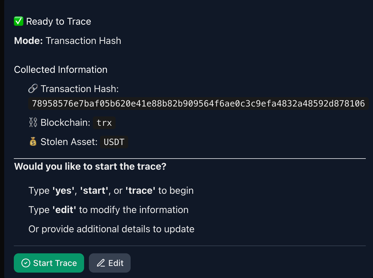 The workflow is straightforward. Enter the transaction hash associated with the theft, specify the blockchain (Tron, Ethereum, and others are supported) and the stolen asset. That's the full input. The system confirms the collected details and asks whether you want to start the trace.