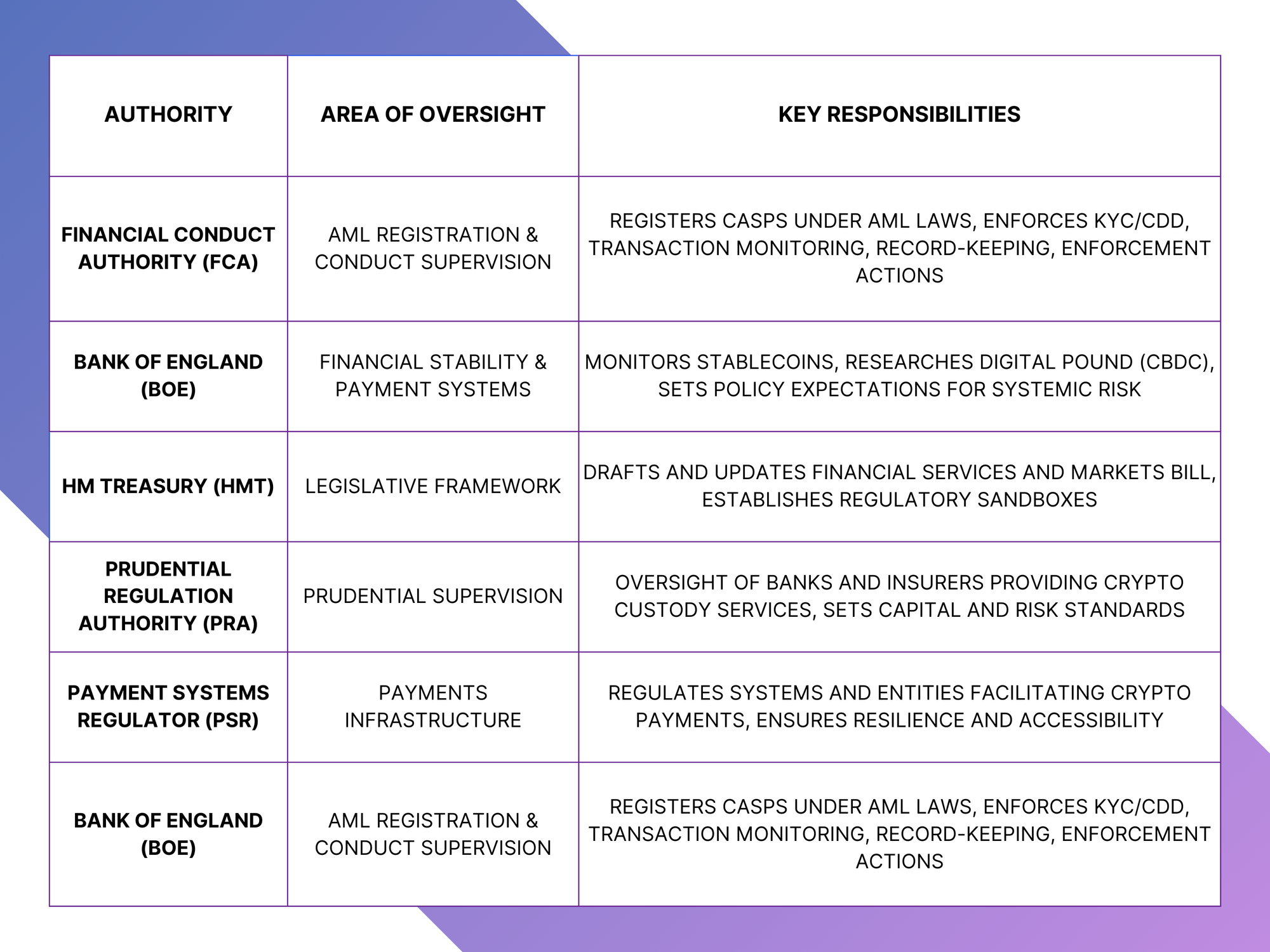 On the banking side, the Bank of England (BoE) oversees the stability of payment systems and monitors systemic risks posed by stablecoins, while also exploring the potential issuance of a digital pound (CBDC). Meanwhile, stablecoins that provide payment services fall under the Payment Services Regulations 2017, triggering additional licensing requirements and oversight for providers handling e-money and payment operations.