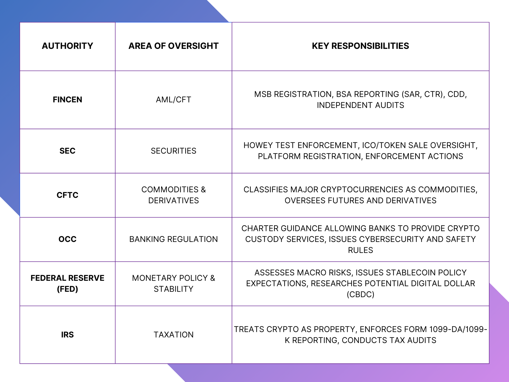 The United States relies on a layered, multi-agency model to oversee cryptocurrency activities, with each regulator focusing on a distinct slice of the market yet coordinating to form a cohesive compliance landscape. For founders, this means there is no single “crypto regulator”. Instead, different agencies handle AML, securities, commodities, banking, taxation, and state-level licensing. Сrypto firms must comply with at least six layers of oversight: AML (FinCEN), securities (SEC), commodities (CFTC), banking (OCC & Fed), taxation (IRS), sanctions (OFAC), and state licensing (e.g., BitLicense).