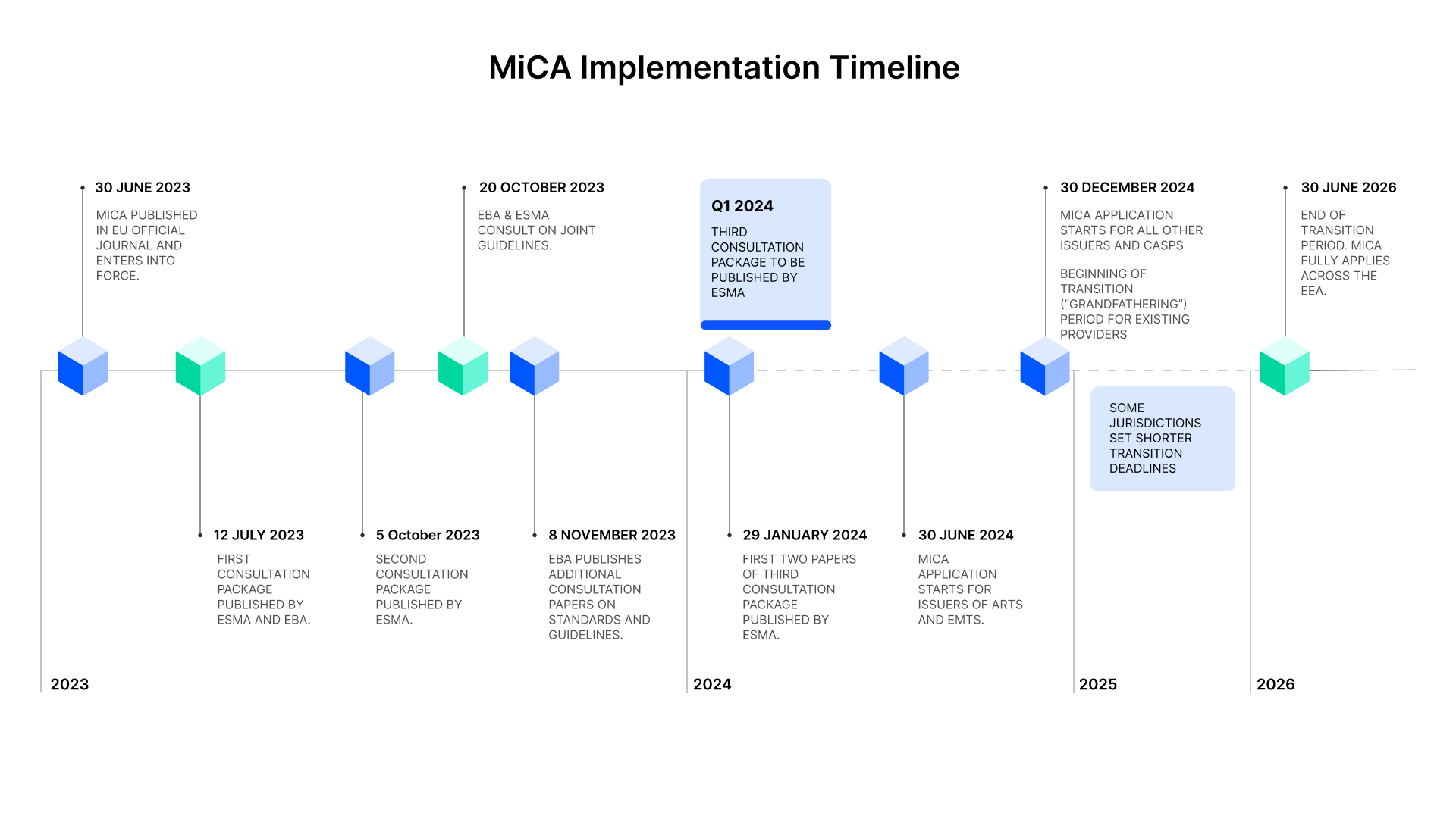 MiCA officially began applying on December 30, 2024, with a transitional period extending until July 2026 for companies that were already operating under national laws.