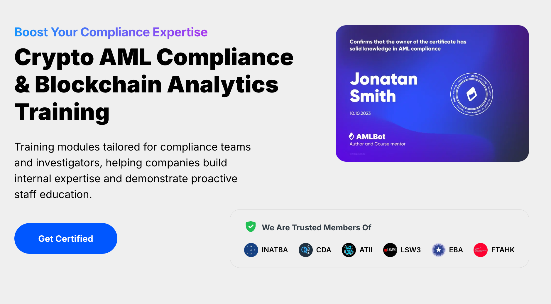 AMLBot also offers training modules for compliance teams and investigators: AML Fundamentals for Crypto Business Training & Certification and Blockchain Analytics Mastery Training & Certification. Our programs go beyond theory by combining expert-led content with real-world case studies, practical tools, and compliance checklists that can be applied immediately in business operations. All the participants gain an industry-recognized certification, up-to-date knowledge aligned with global regulations (FATF, MiCA, FinCEN, SEC), and insights into current trends in crypto crime.