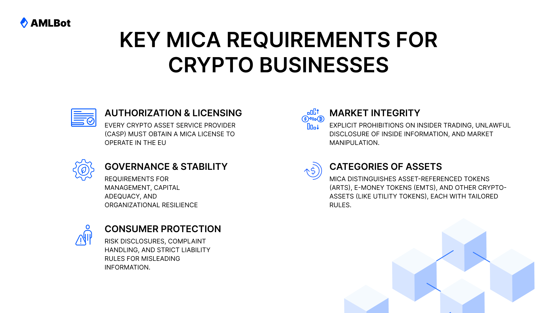 MiCA (Regulation (EU) 2023/1114) sets uniform EU-wide rules for issuing and trading crypto-assets. It covers: