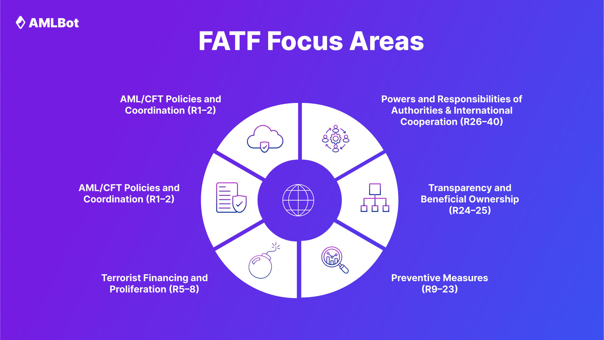 Note: The FATF 40 Recommendations are universal standards for all financial institutions, DNFBPs (Designated Non-Financial Businesses and Professions), and now VASPs* (Virtual Asset Service Providers). In 2019, FATF introduced the Interpretive Note to Recommendation 15, which explicitly extended AML/CFT rules to cryptocurrencies and VASPs. There is no separate “crypto block” among the six groups. Instead, crypto businesses are integrated into the same framework, with specific clarifications for KYC (R10), new technologies (R15), and the Travel Rule (R16).
