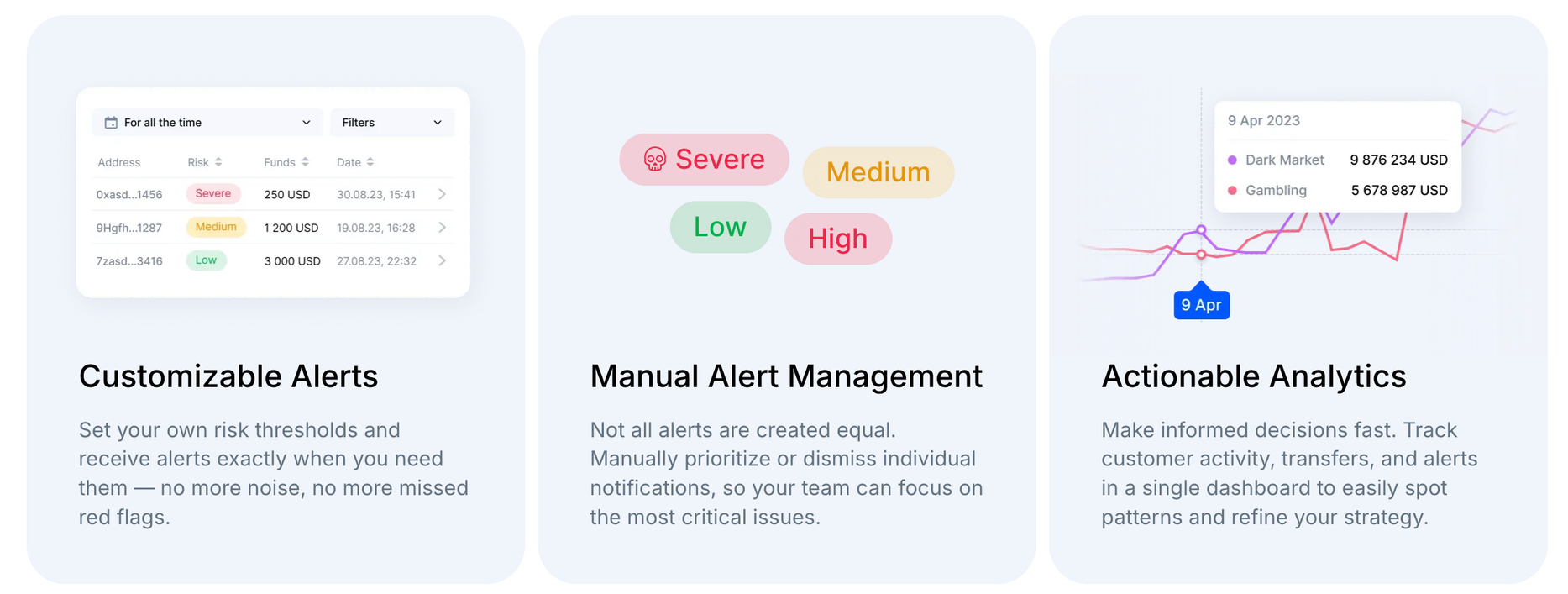 - Multi-Chain Coverage. Illicit fund flows do not stay on a single blockchain. Effective monitoring must span the chains where the business operates and where its customers' funds originate — including Ethereum, TRON, Bitcoin, Solana, and relevant Layer 2 networks.