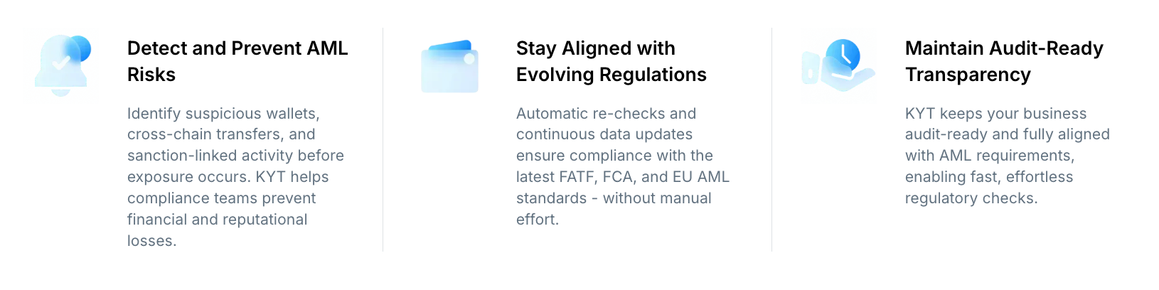 KYT is a compliance process that focuses on monitoring transaction behavior rather than user identity, helping businesses detect illicit activity such as fraud, money laundering, or sanctions exposure.