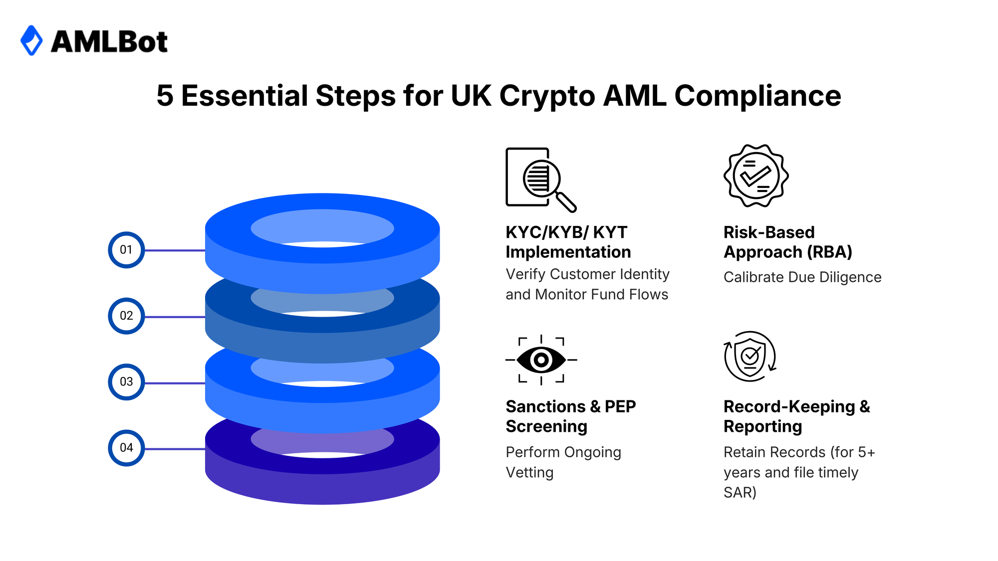 In practical terms, UK crypto businesses must integrate KYC/KYB Processes, KYT (Know Your Transaction), and a Risk-Based Compliance Approach into their operations.
