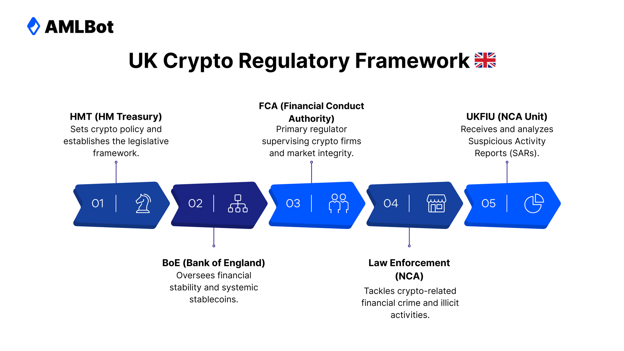 The UK’s multi-agency regulatory model involves several key bodies: (1) HM Treasury (HMT) sets crypto policy and legislation; (2) the Financial Conduct Authority (FCA) is the primary regulator supervising crypto firms; (3) the Bank of England (BoE) oversees financial stability and systemic stablecoins; and (3) law enforcement agencies like the National Crime Agency (NCA) (with its UK Financial Intelligence Unit, UKFIU) handle crypto-related financial crime and receive suspicious activity reports.