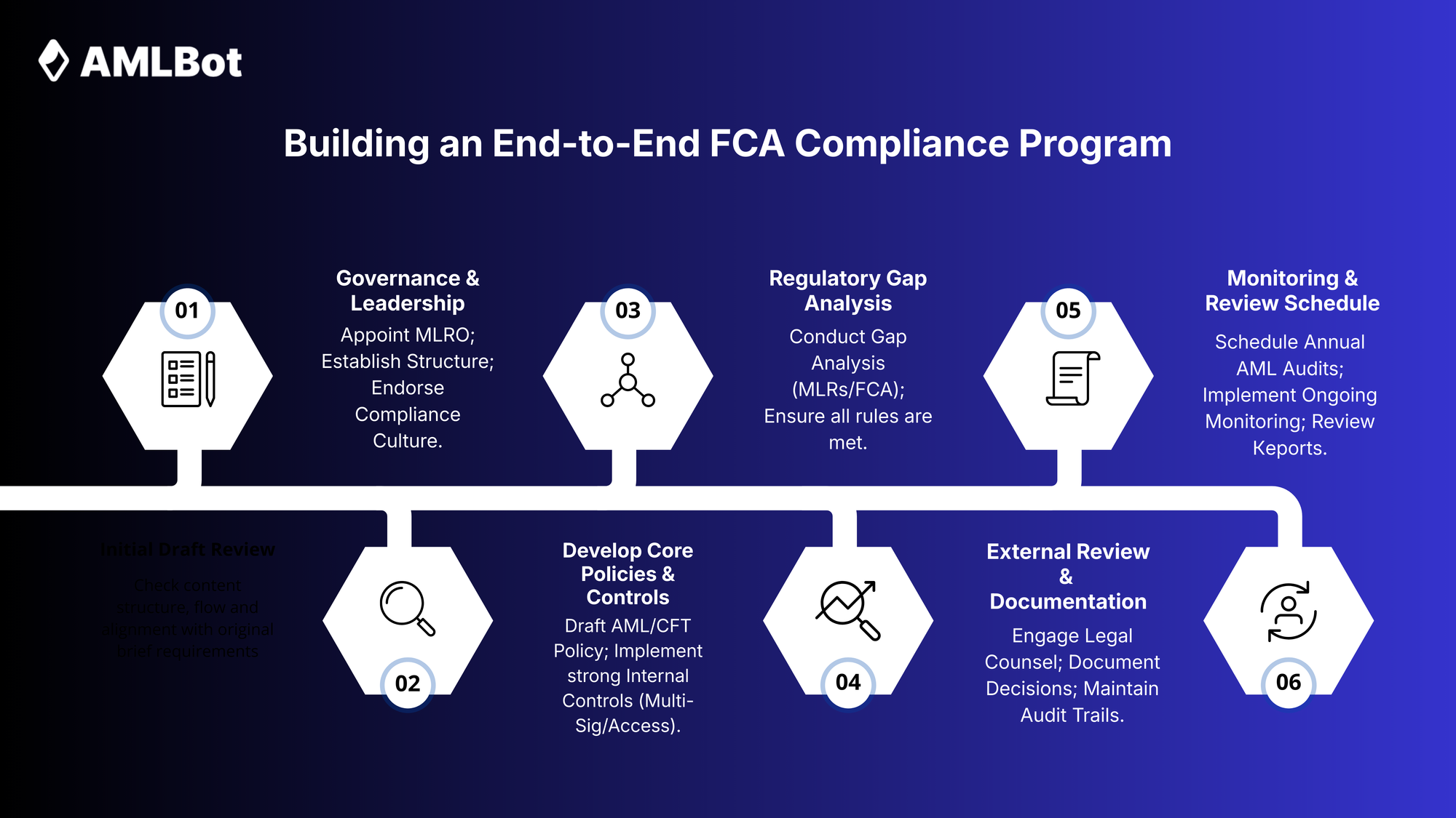 - Keep in mind that compliance is not static. Set up a Monitoring and Review Schedule. E.g., an annual AML audit, periodic penetration tests of your cybersecurity, and quarterly internal compliance reports summarizing any issues.