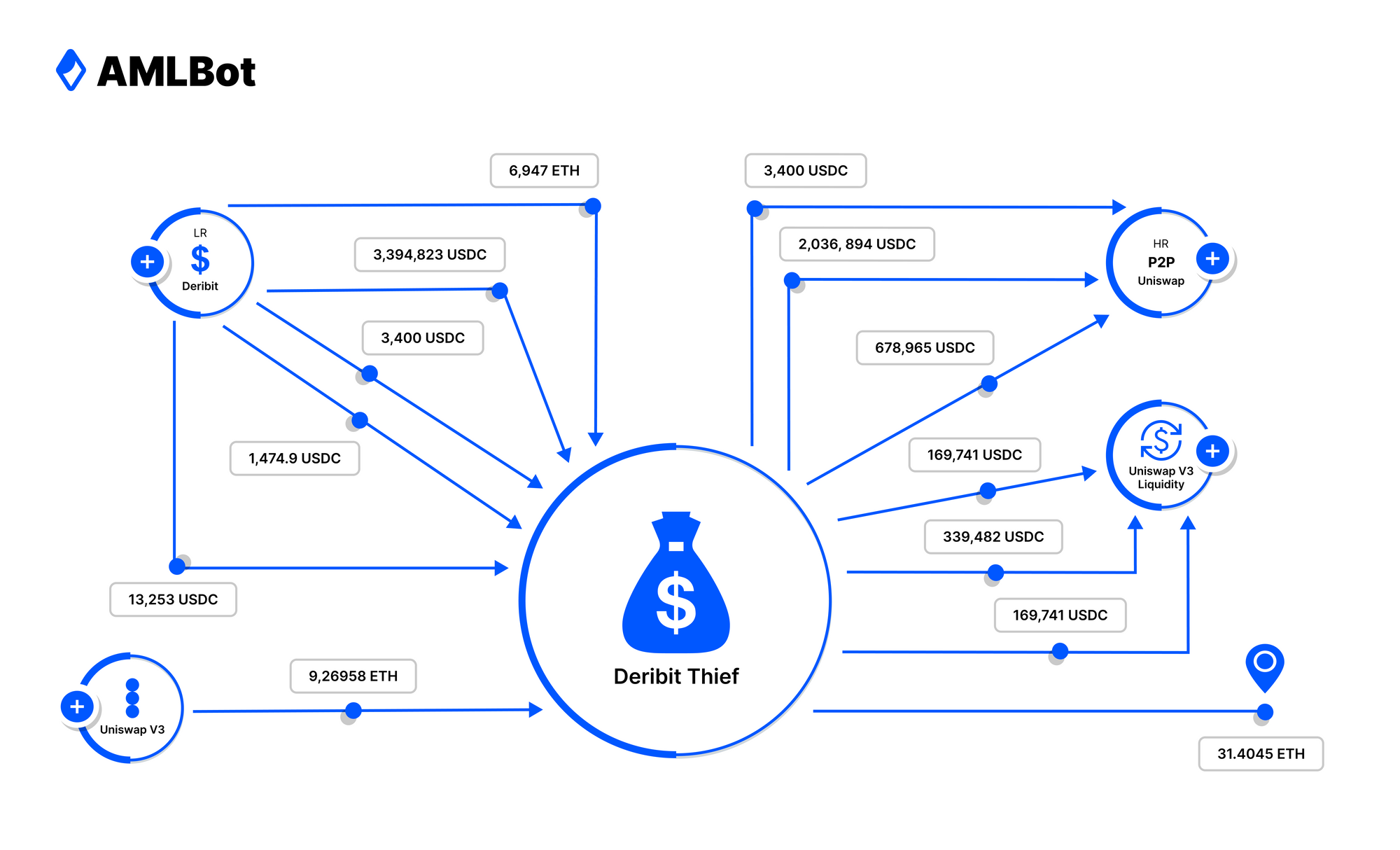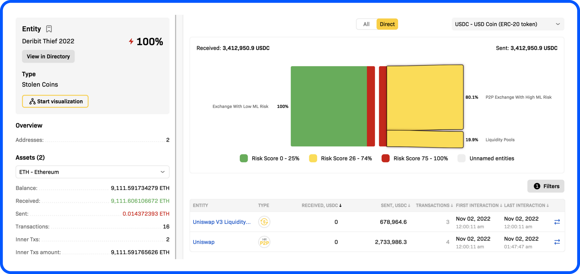 In the investigative diagram below you will see stolen funds ETH and USDC moving from Deribit hot wallet to the “Deribit Thief”. The USDC is then converted to ETH at the decentralized exchange Uniswap.