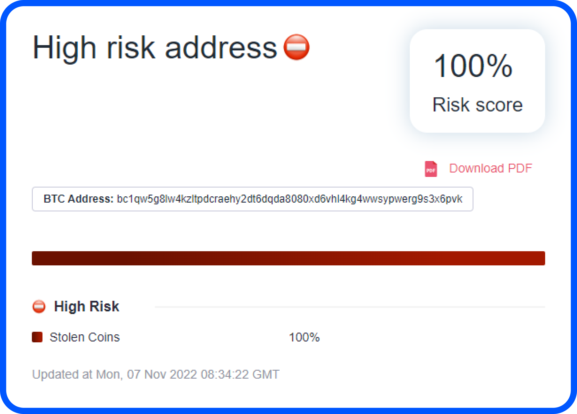 At the time of writing this article the funds haven’t moved anywhere particularly not to any mixers or laundering services. As you will see in the figure below our risk score assesment reveals that these are “Stolen Funds”.