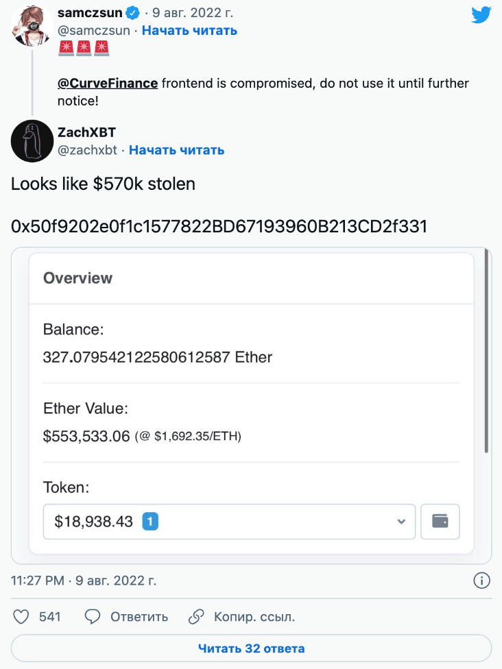 “As you know, decentralized trading platform Curve Finance confirmed reports that its website was attacked by an external threat on Tuesday. The hackers appear to have compromised the Curve platform’s website or domain name in order to redirect users or their transactions to another location. The hackers managed to get away with $570,000 in ETH equivalent.”