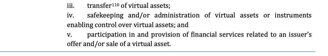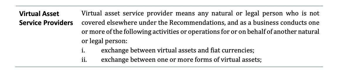 FATF defines a VASP as a person or company that, “as a business”, conducts certain activities “for or on behalf of another” person, including exchange and transfer.
