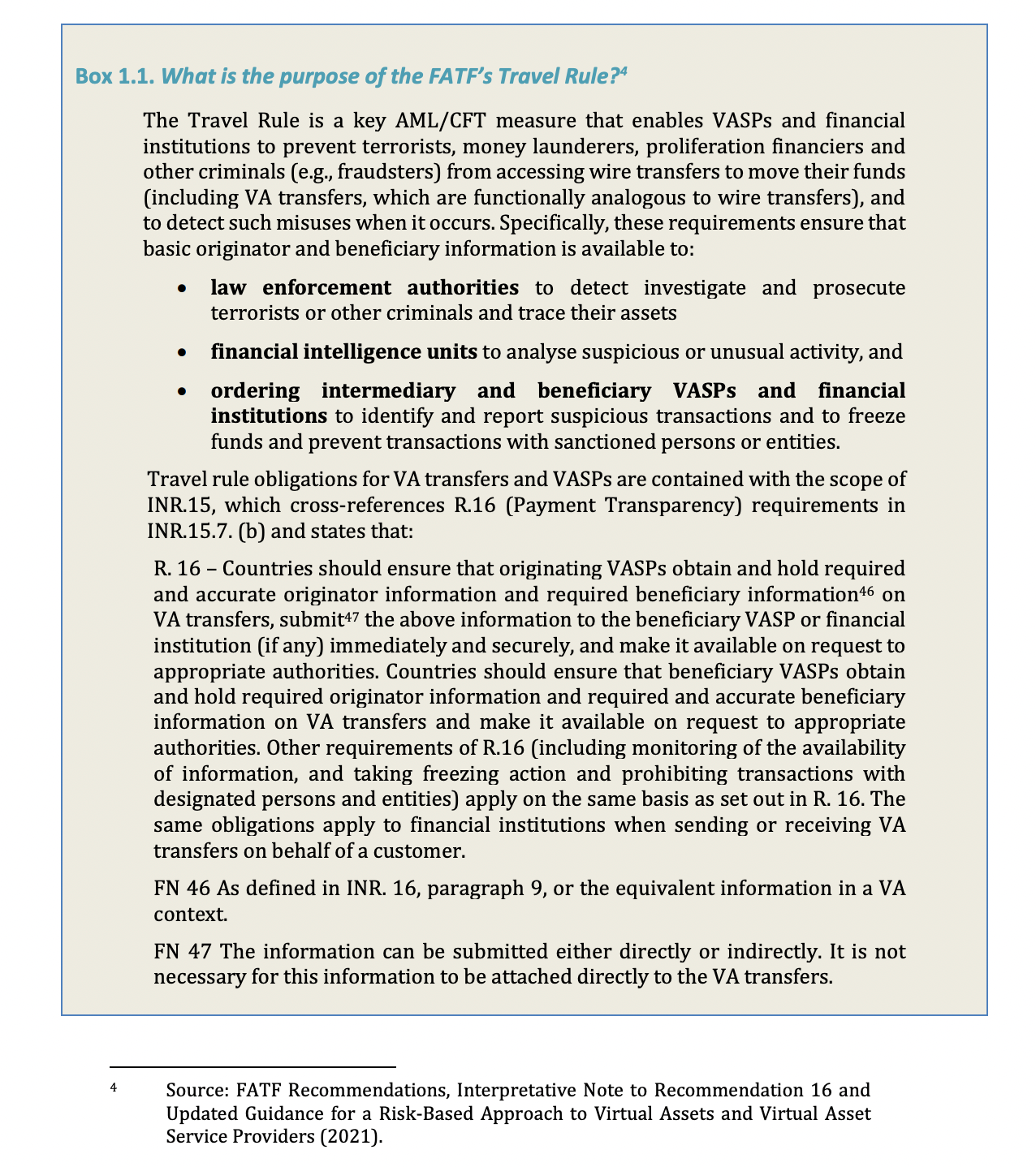 In plain terms, the Travel Rule is FATF’s payment-transparency expectation: identifying information about the parties to a transfer should not be lost as value moves through regulated intermediaries.
