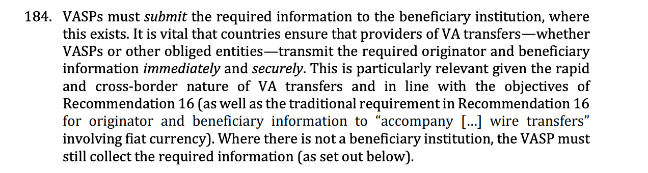“The information can be submitted either directly or indirectly. It is not necessary for this information to be attached directly to the VA transfers.” FATF’s Updated Guidance explains the same idea in timing terms: post-transfer submission should not be permitted, and submission “must occur before or when the VA transfer is conducted.”