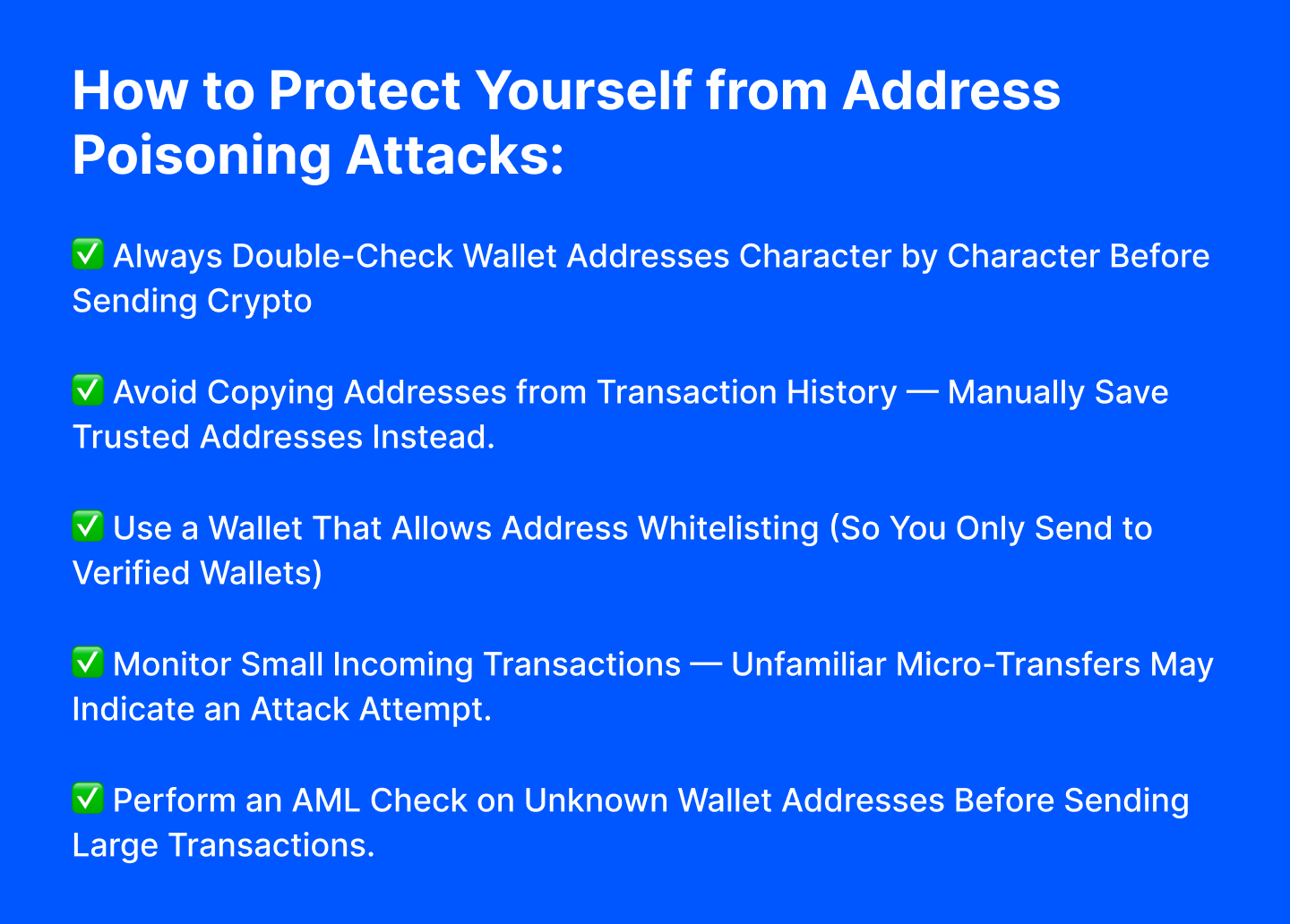 While address poisoning attacks are sneaky, they aren't unstoppable. By staying vigilant, using secure practices, and leveraging AML tools, you can ensure your funds remain exactly where they belong — safe and under your control.