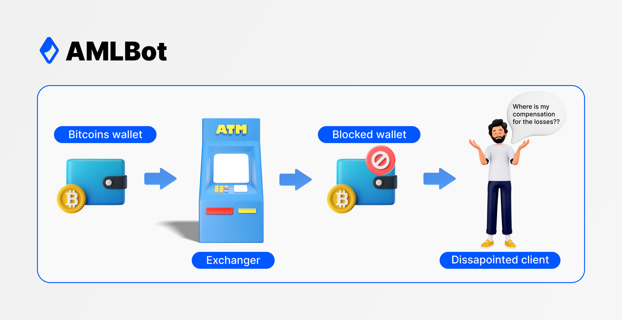 Imagine a situation where a client came to the exchanger who wants to exchange US dollars for BTC. He sends money to another user, receives the desired bitcoins to his wallet, and then sends them to the exchange and suddenly he is blocked due to involvement in money laundering and fraud. Who will be to blame for this? Of course, the user will go to where he received these Bitcoins in an effort to try to find out why bad assets were sent to him and demand compensation for their losses. This situation can happen with every exchanger.