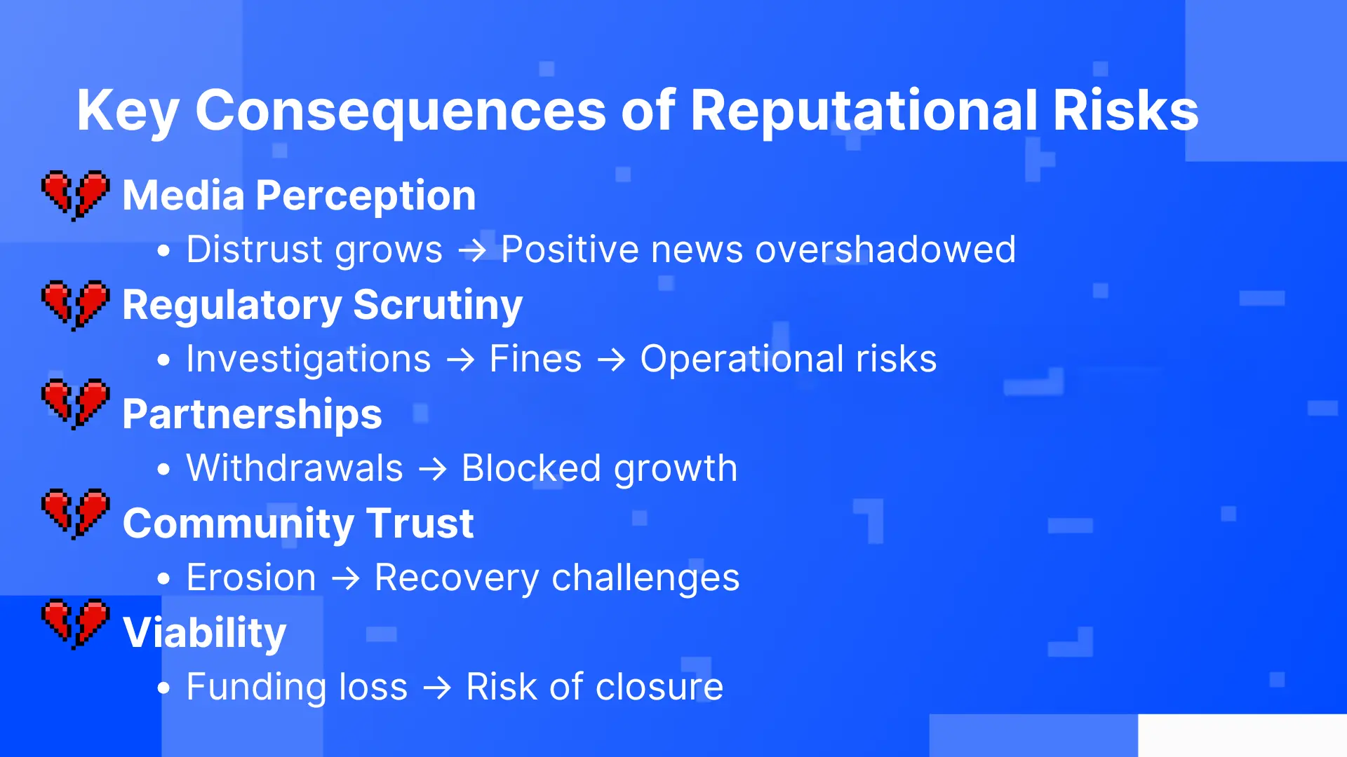 - Reputational risks impact trust, investor confidence, and regulatory standing.