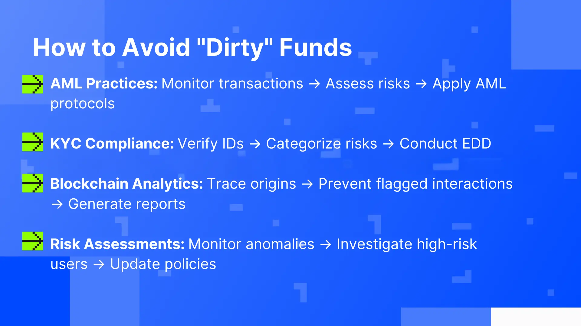 Dirty funds refer to assets acquired by illegal activities such as fraud, hacking, or money laundering, often involving activities like drug trafficking, tax evasion, and corruption. These funds are typically hidden in complex networks of transactions to look legitimate, making them difficult to detect without robust compliance measures. When such funds infiltrate a crypto project, even unknowingly, the consequences can be severe. Reputational damage can spread quickly across investor communities, media, and regulators, leading to accusations of fraud. A single transaction involving hidden assets can ruin a project's address history, trigger investigations, and undermine trust among stakeholders. Addressing these risks requires AML (Anti-Money Laundering) guidelines and KYC (Know Your Customer) compliance to ensure the integrity and transparency of all transactions.