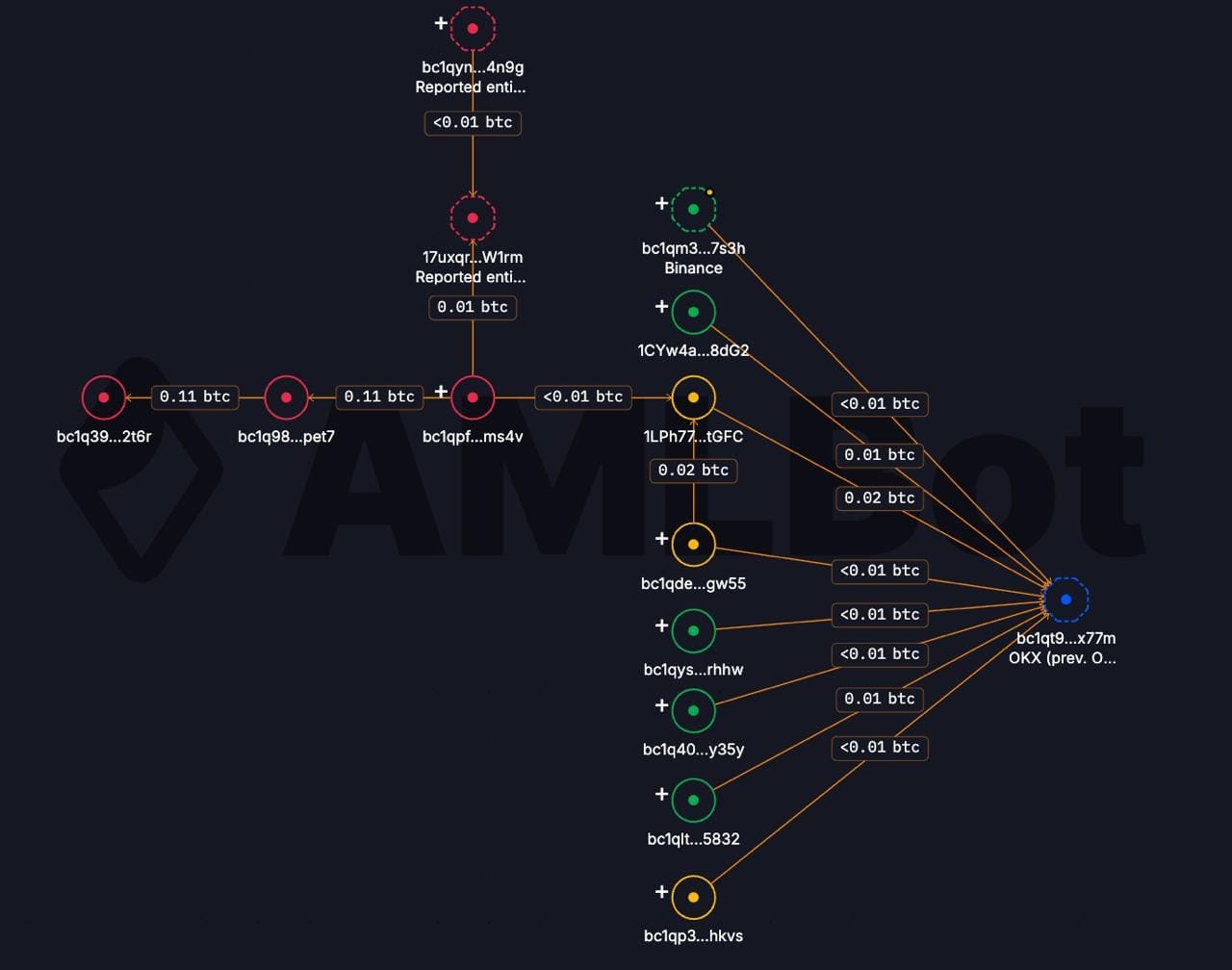AMLBot traced the specific payment endpoint bc1qt9f82xyvvdql3ypma43vccutv60kjsdzee0ltpw7p4742augxgjs24x77m, identified as an OKX deposit address. The analysis showed dozens of micropayments (mostly <0.01 BTC) from buyer wallets, several of which were previously reported for illicit activity, merging into that OKX address.
