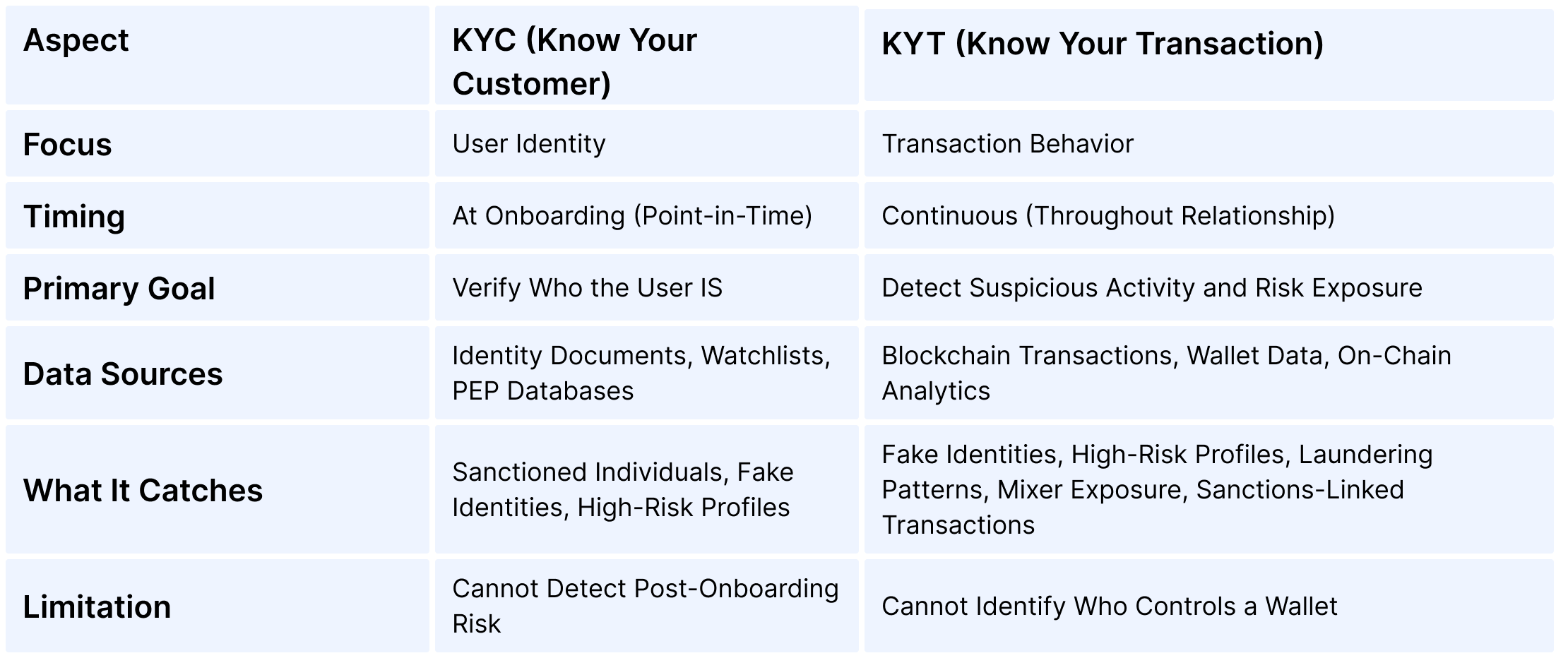 KYC verifies a user's identity, while KYT monitors transaction activity to detect suspicious behavior and assess risk over time.