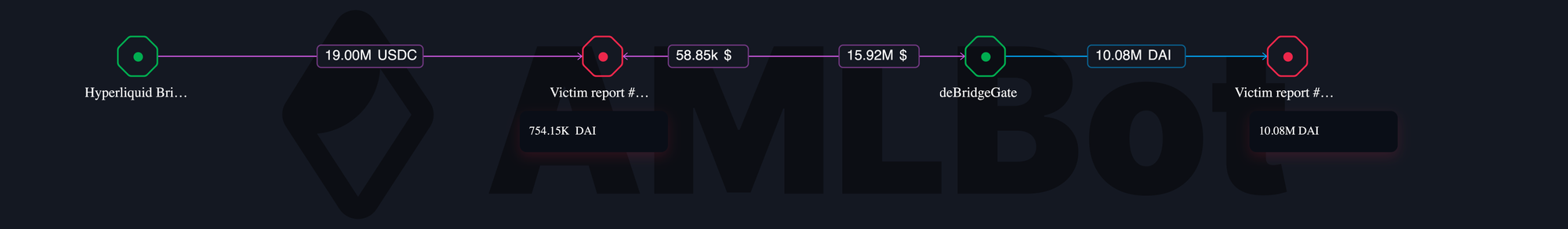 A Hyperliquid whale lost $20M+ after a private-key compromise. Using AMLBot’s Tracer, we mapped the visible on-chain flow: ~$17M moved from the trader’s wallet to Arbitrum, was bridged (incl. via deBridge) and converted to DAI. Another ~$3.1M in MSYRUPUSDP was taken from the Plasma Syrup Vault to a new address. It was not a smart-contract exploit. This was an endpoint/key compromise.