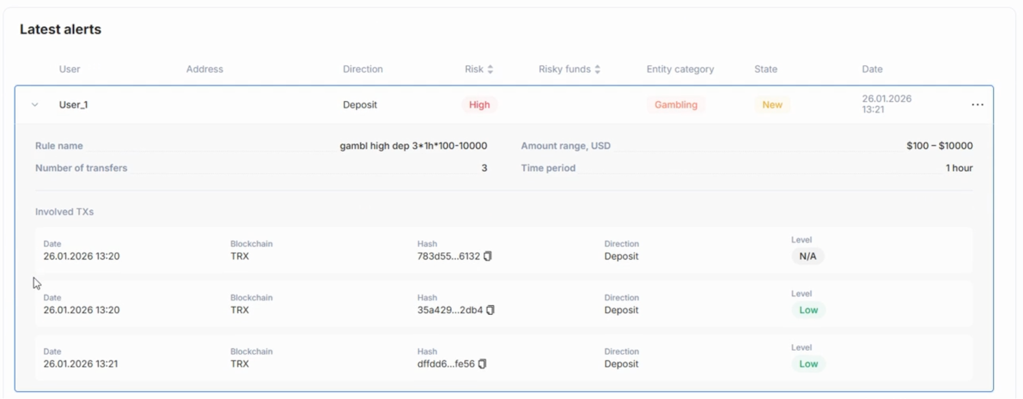 Now consider a customer who performs three deposits within one hour. The first transfer contains 160 USD gambling exposure but does not trigger a transaction alert. The second transfer contains 493 USD gambling exposure and generates a Low-Risk transaction alert. The third transfer contains 378 USD gambling exposure and again produces only a Low-risk event.