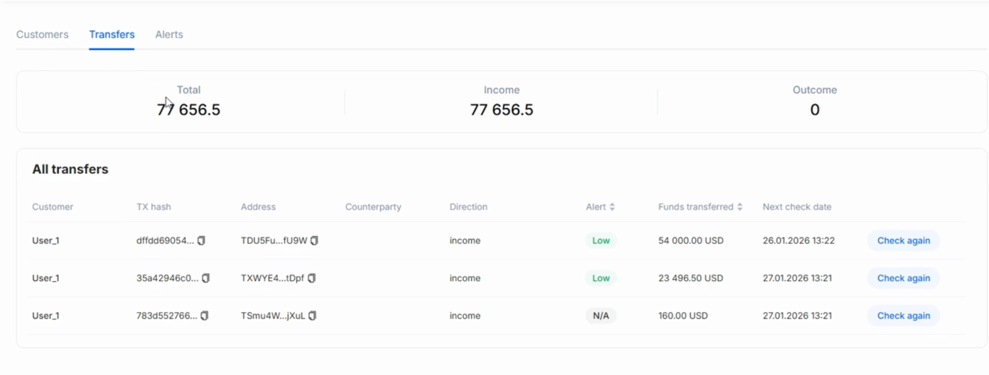 In AMLBot’s implementation, transactions remain the primary objects of monitoring. Customers are created automatically when transactions are added to monitoring using a Customer Identifier. Behavioral rules do not operate on wallet addresses or account entities. Instead, they evaluate transactions grouped under each customer identifier. Customers, therefore, function as aggregation containers for transaction activity rather than blockchain identity objects. Transactions belonging to the same customer may originate from any supported blockchain, and behavioral evaluation aggregates activity across chains without distinction. Rules apply globally across monitored customers, but are evaluated separately for each customer.