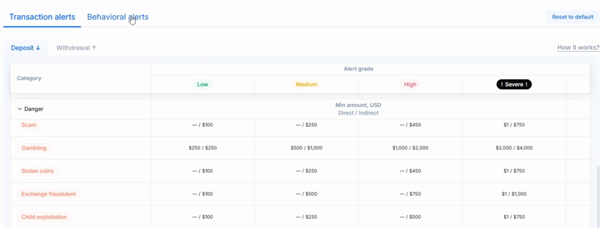 Transaction Alerts are triggered when a single transfer exceeds a configured risk threshold. For example, when a deposit carries significant exposure to sanctioned entities or darknet markets. Behavioral Alerts, on the other hand, are triggered when a pattern of activity across multiple transactions matches a predefined rule. For instance, several individually low-risk deposits may collectively indicate structuring if they accumulate significant exposure to a specific risk category within a short time window.
