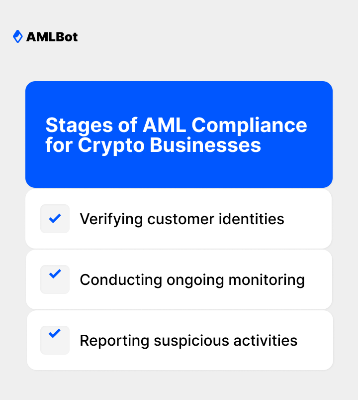 Businesses can also partner with AML compliance platforms and services like AMLBot. Using automation makes compliance more streamlined and affordable. For example, AMLBot can help crypto businesses develop their AML procedures and training, implement KYC processes to verify user information, and track the source and destinations of crypto transactions.