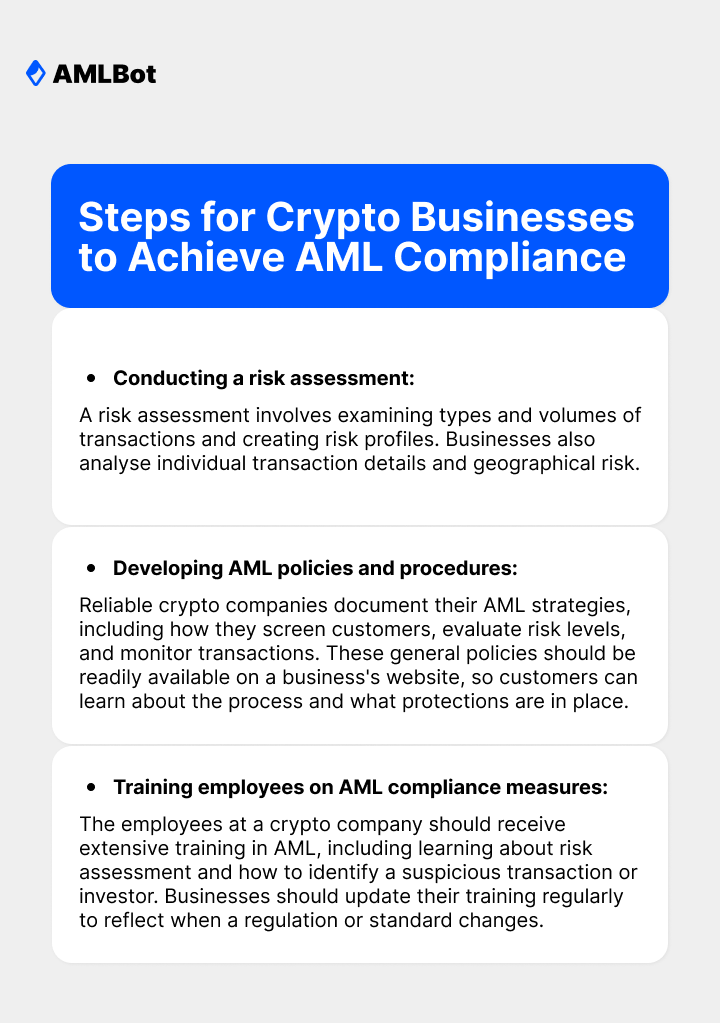 - Training employees on AML compliance measures: The employees at a crypto company should receive extensive training in AML, including learning about risk assessment and how to identify a suspicious transaction or investor. Businesses should update their training regularly to reflect when a regulation or standard changes.